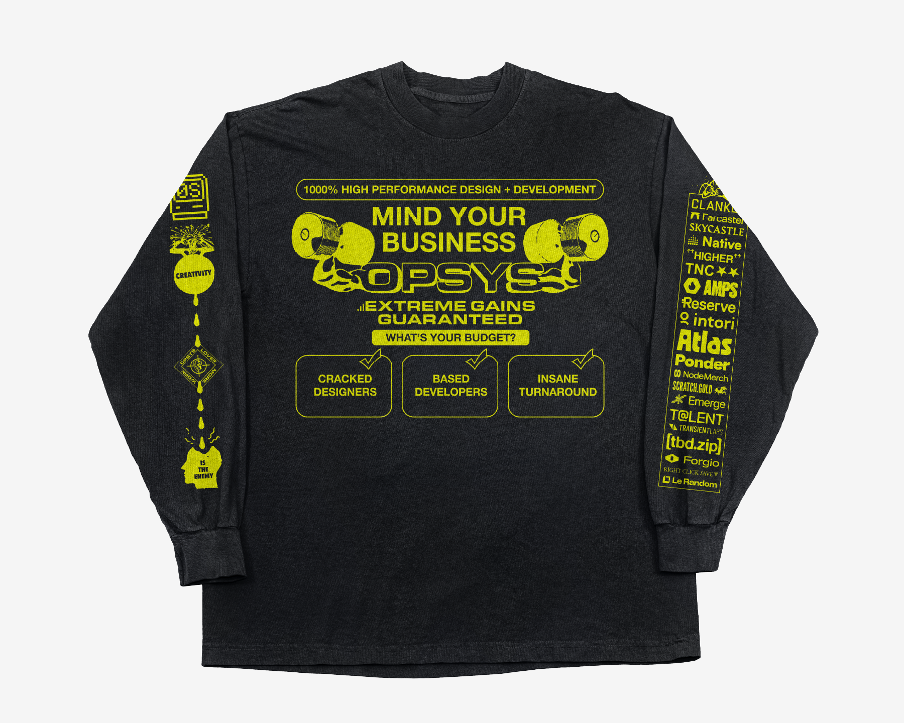 Every client from 2025 printed on the sleeve. Front changes yearly, client roster stays. Wearable annual recap touted like a banned 90's pre-workout stimulant.