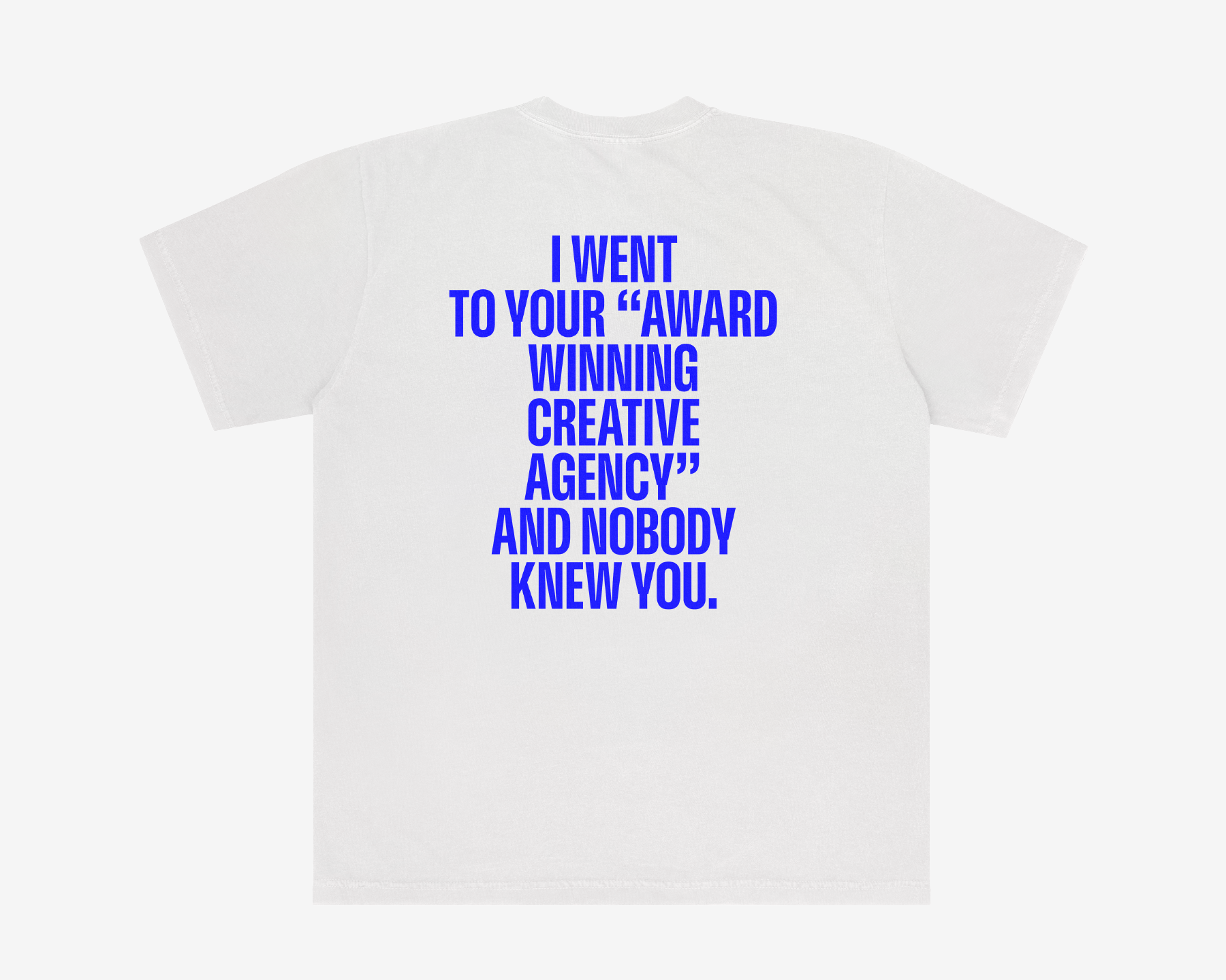 Gold's Gym bootleg meets agentic uber-tool. Back: "I went to your award-winning creative agency and nobody knew you." Work hard, lift harder. Agency life shit.